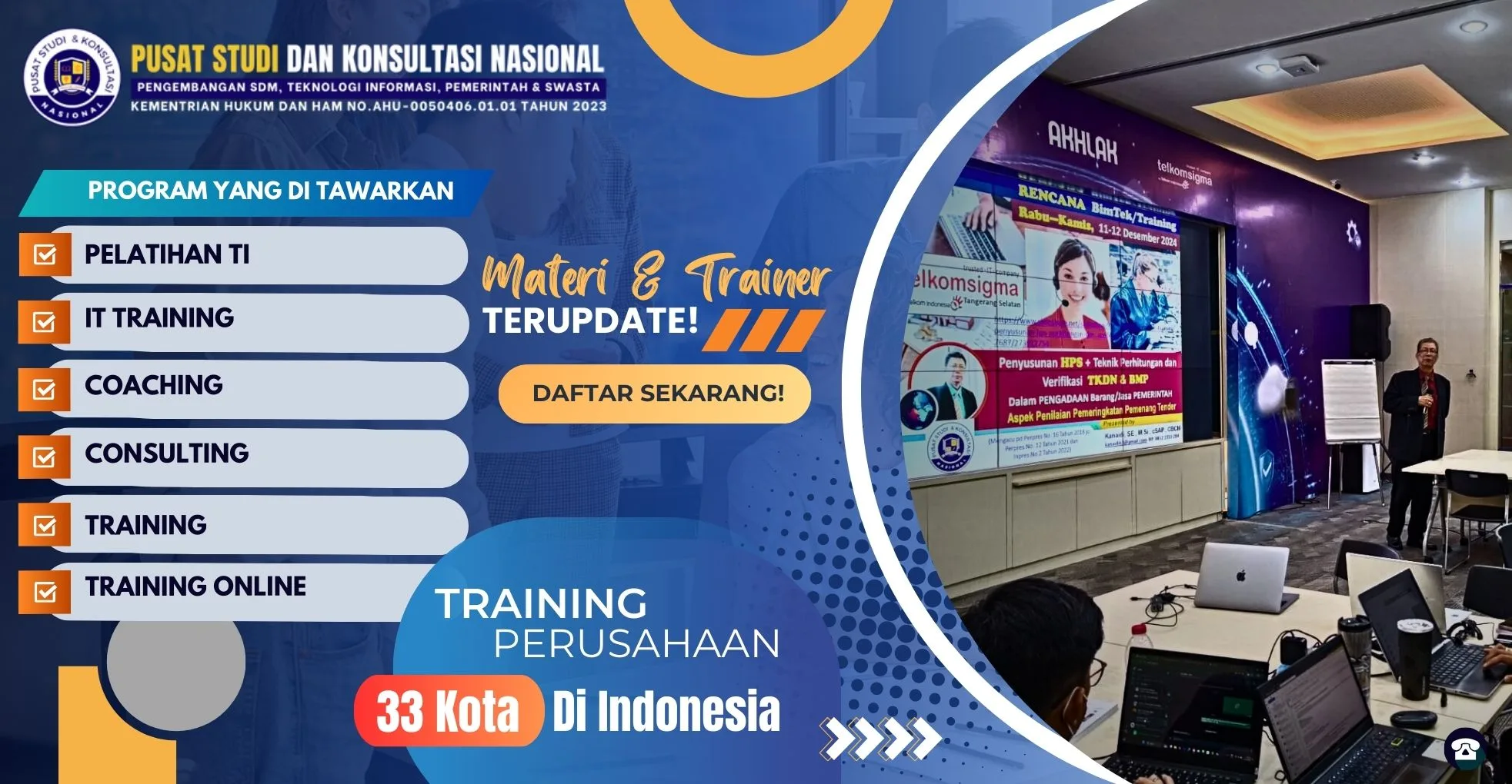 Seluruh program pelatihan dirancang sesuai dengan kebutuhan instansi dan perkembangan teknologi serta regulasi terbaru, sehingga langsung aplikatif di lapangan.