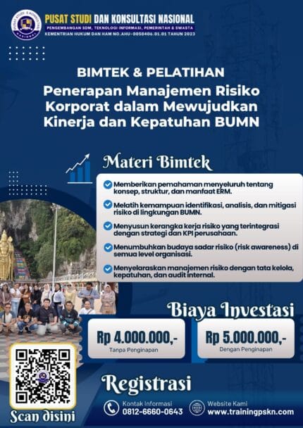 • Pelatihan Penerapan Manajemen Risiko Korporat dalam Mewujudkan Kinerja dan Kepatuhan BUMN Pelatihan Penerapan Manajemen Risiko Korporat dalam Mewujudkan Kinerja dan Kepatuhan BUMN Rp4.000.000