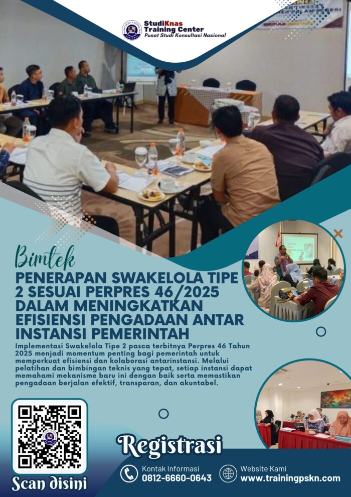 Tingkatkan profesionalisme aparatur pemerintah Anda melalui Bimtek Penerapan Swakelola Tipe 2 Sesuai Perpres 46/2025 bersama Studiknas Training Center untuk mewujudkan tata kelola pengadaan yang efisien dan berintegritas.