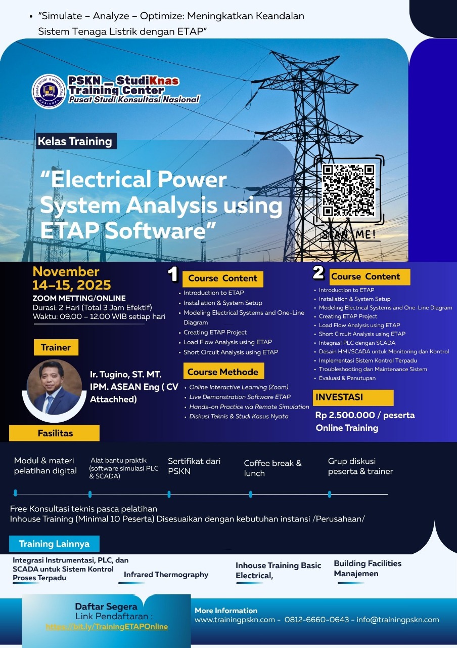 Pelatihan unggulan dari PSKN – StudiKnas Training Center (Pusat Studi Konsultasi Nasional) ini dirancang khusus untuk para profesional di bidang kelistrikan, engineering, dan industri yang ingin menguasai kemampuan analisis sistem tenaga listrik menggunakan ETAP Software secara komprehensif.
