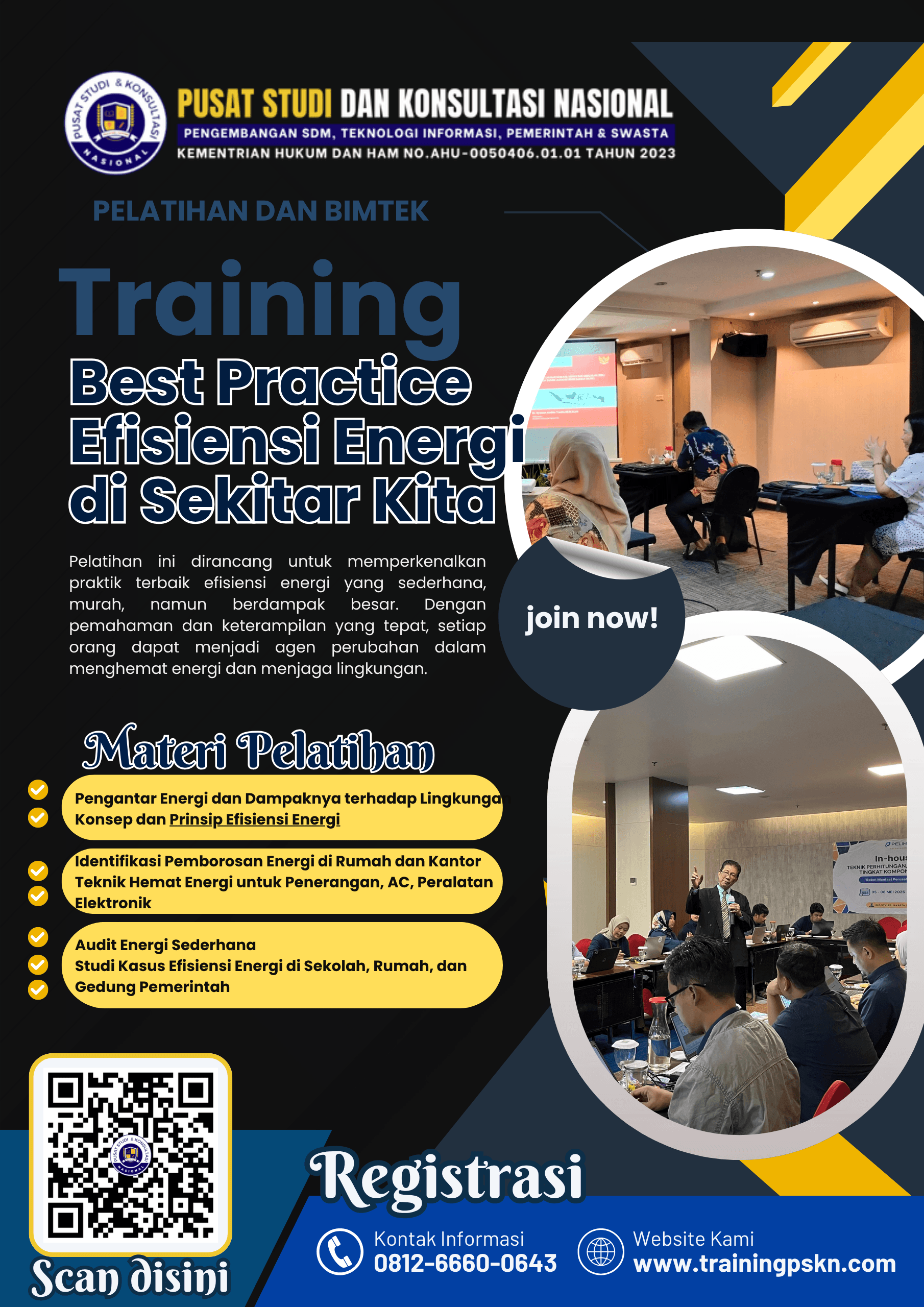 Pelatihan ini dirancang untuk memperkenalkan praktik terbaik efisiensi energi yang sederhana, murah, namun berdampak besar. Dengan pemahaman dan keterampilan yang tepat, setiap orang dapat menjadi agen perubahan dalam menghemat energi dan menjaga lingkungan.