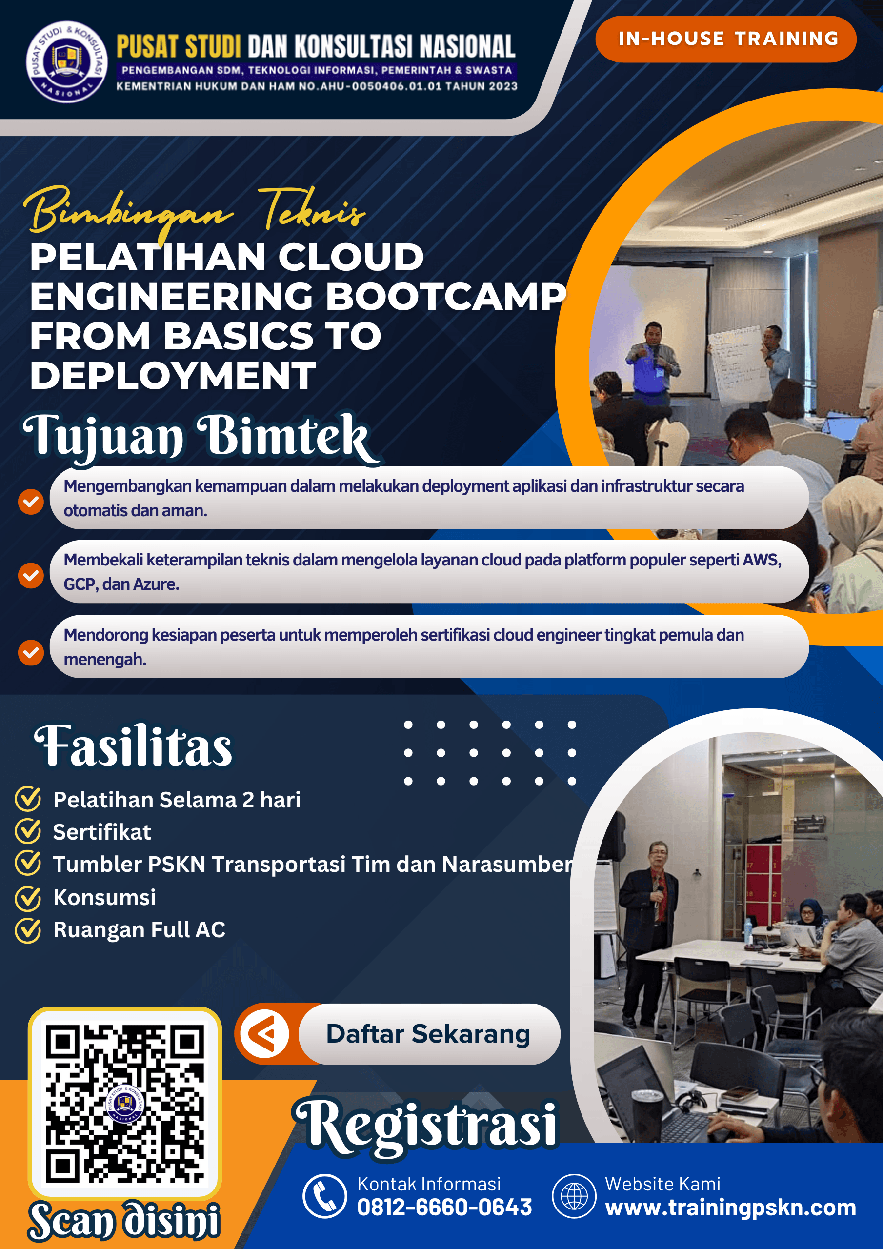Pelatihan ini dirancang untuk membekali peserta dengan kompetensi teknis dalam bidang cloud computing, mulai dari konsep dasar, layanan IaaS dan PaaS, hingga praktik deployment menggunakan platform seperti AWS, Google Cloud, dan Azure. Dengan kurikulum berbasis praktik langsung, peserta akan memperoleh pengalaman membangun dan mengelola infrastruktur cloud secara profesional.
