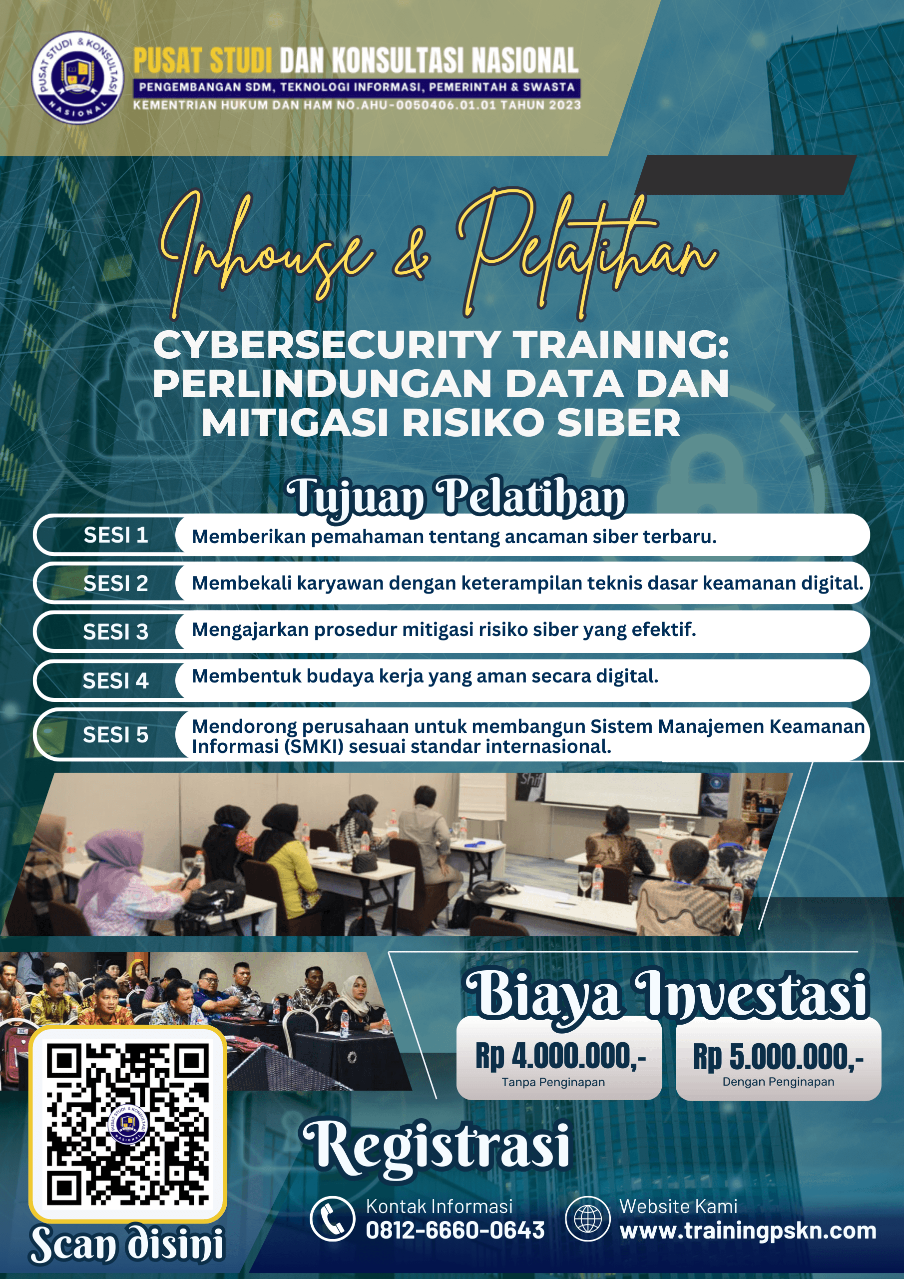 Pelatihan Cybersecurity Training: Perlindungan Data dan Mitigasi Risiko Siber adalah kebutuhan utama bagi setiap organisasi di era digital. Pelatihan ini membangun kesadaran, keterampilan, dan budaya keamanan digital yang akan melindungi perusahaan dari ancaman siber yang semakin kompleks.