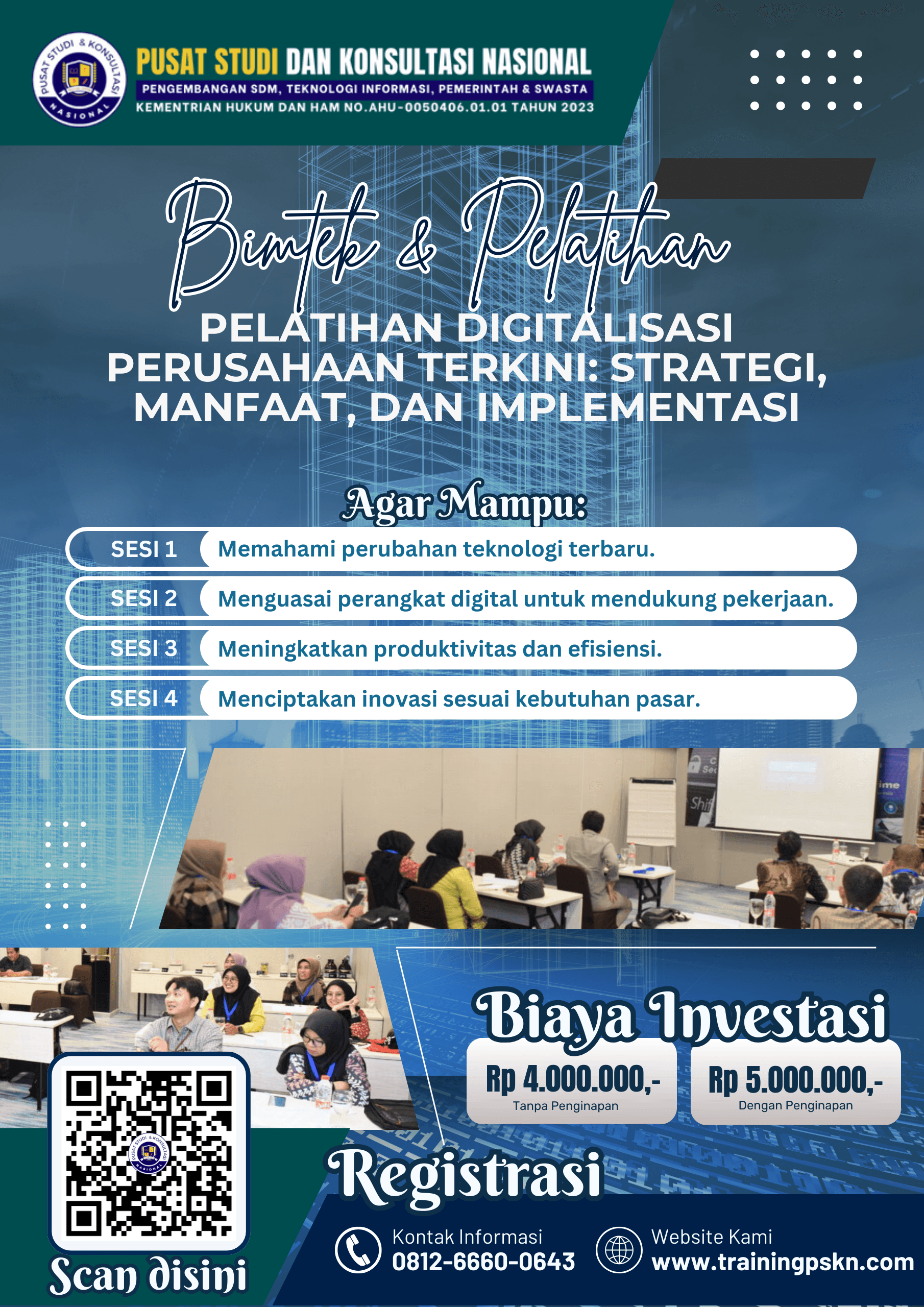 Pelatihan Digitalisasi Perusahaan Terkini membantu bisnis meningkatkan efisiensi, inovasi, dan daya saing di era transformasi digital.