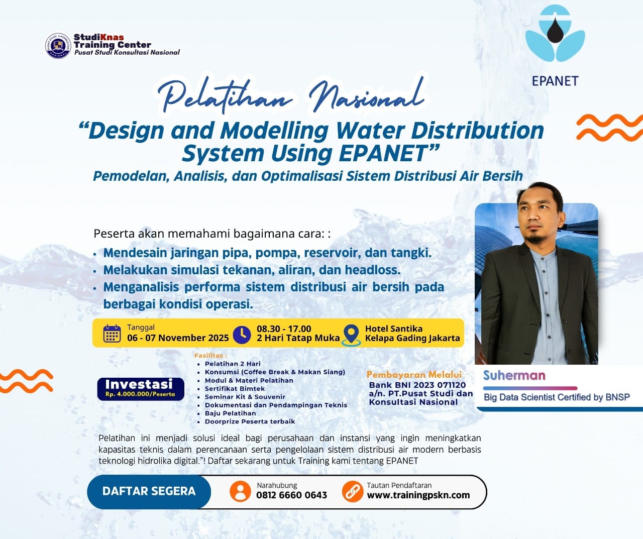 Pelatihan ini akan dipandu oleh Suherman, seorang Big Data Scientist Certified by BNSP, yang memiliki pengalaman dalam analisis sistem hidrolika dan implementasi teknologi data pada sistem distribusi air. Dengan kompetensi dan sertifikasi yang dimiliki, beliau akan membimbing peserta memahami penerapan model EPANET secara teknis dan aplikatif.