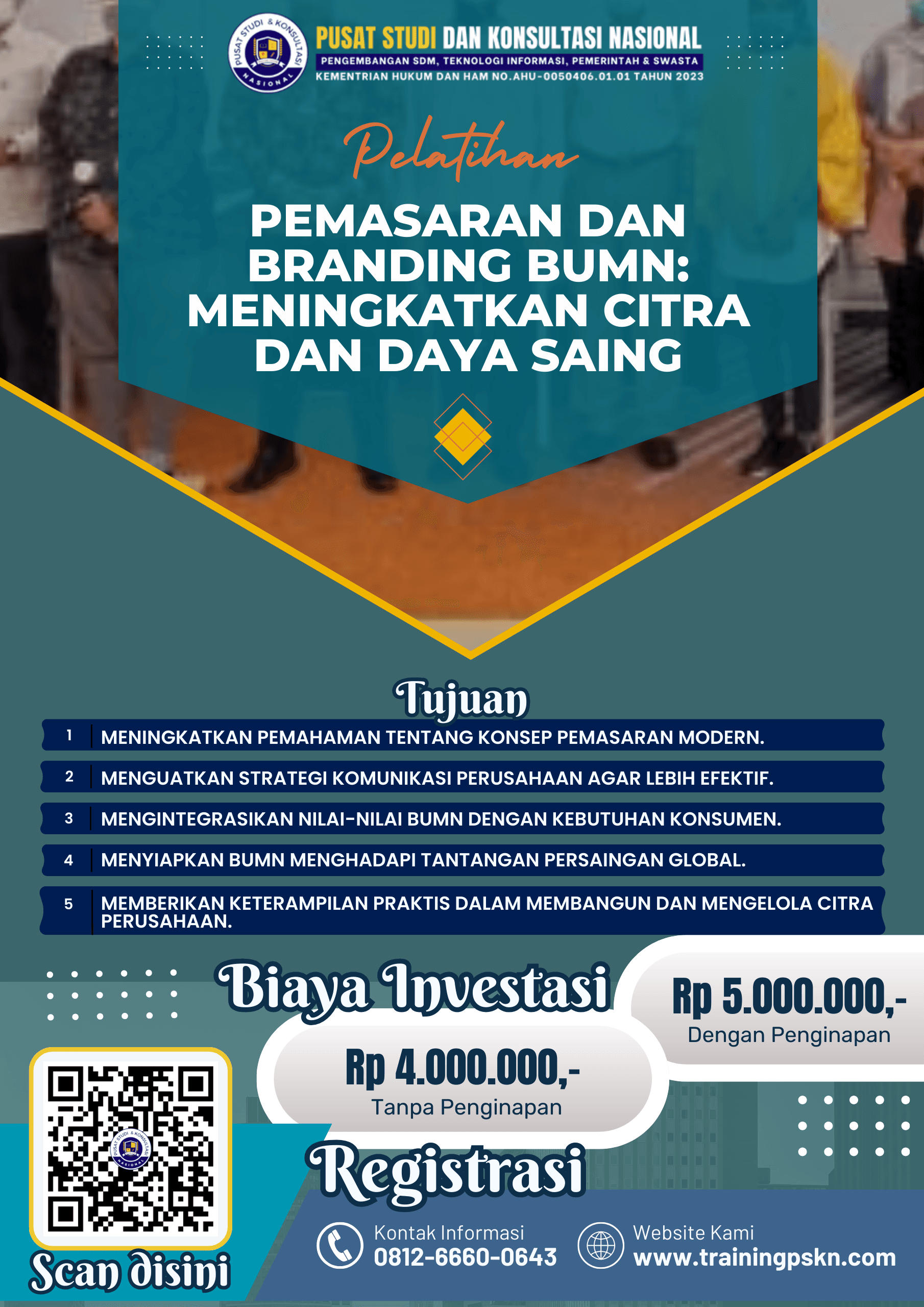 Ingin memperkuat citra dan daya saing BUMN Anda? Segera daftarkan tim perusahaan Anda dalam pelatihan pemasaran dan branding untuk hasil nyata yang berkelanjutan.