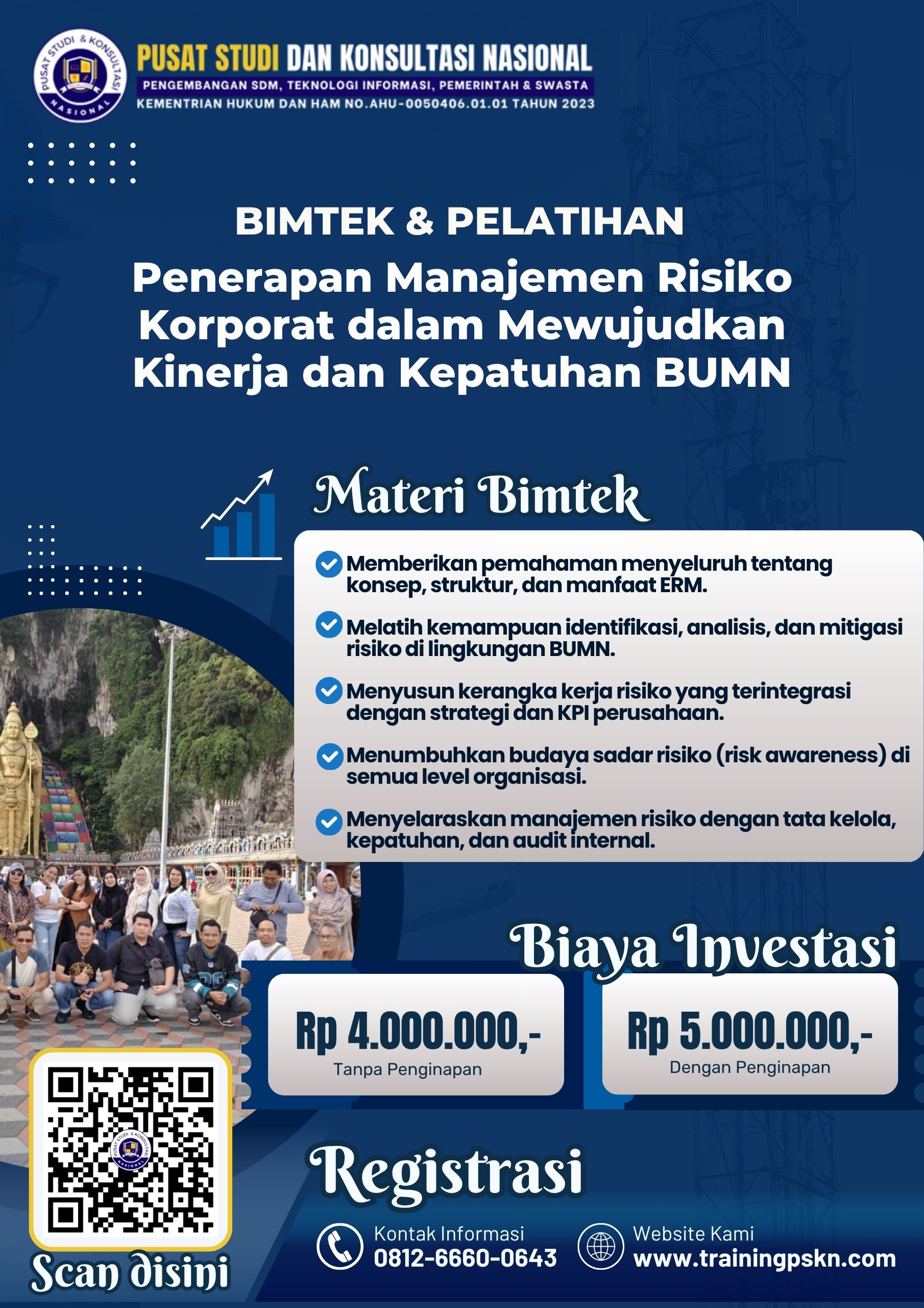 Melalui pelatihan penerapan manajemen risiko korporat, BUMN dapat memperkuat tata kelola, mencegah kerugian, dan memastikan keberlanjutan perusahaan di tengah dinamika bisnis dan regulasi yang kompleks.