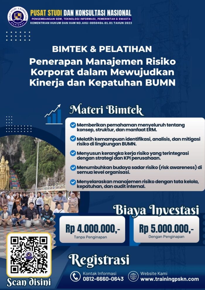 Melalui pelatihan penerapan manajemen risiko korporat, BUMN dapat memperkuat tata kelola, mencegah kerugian, dan memastikan keberlanjutan perusahaan di tengah dinamika bisnis dan regulasi yang kompleks.
