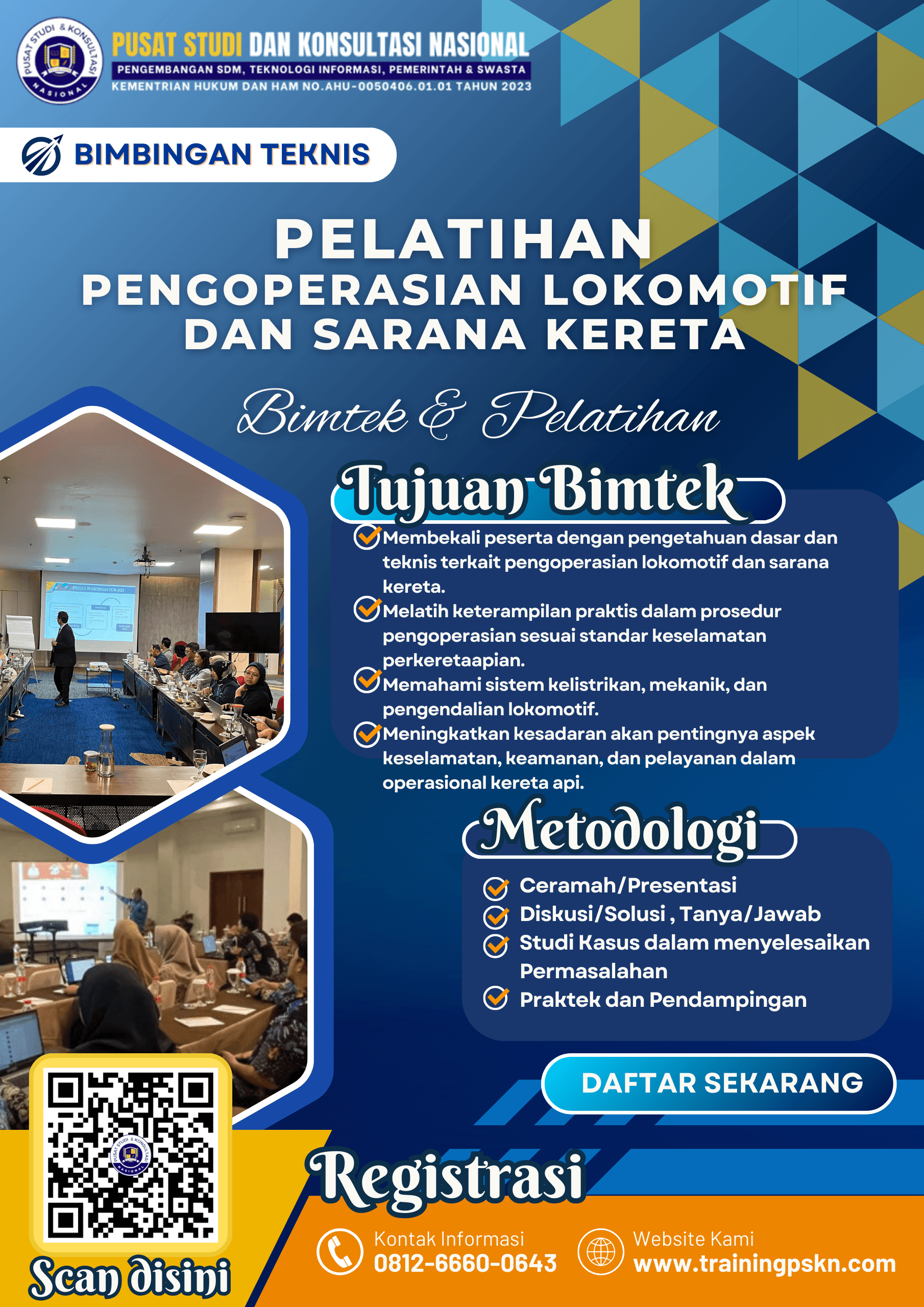 Pelatihan Pengoperasian Lokomotif dan Sarana Kereta dirancang untuk meningkatkan kompetensi SDM perkeretaapian dalam mengoperasikan lokomotif dan sarana kereta secara aman, efisien, dan sesuai standar keselamatan. Program ini mencakup materi teknis tentang struktur lokomotif, sistem pengereman, prosedur operasional, serta penanganan keadaan darurat. Dengan metode pembelajaran berupa teori, studi kasus, simulasi, dan praktik lapangan, pelatihan ini sangat bermanfaat bagi operator, teknisi, maupun petugas pengendali perjalanan kereta api. Tujuannya adalah mendukung kelancaran operasional, keselamatan transportasi, dan peningkatan kualitas layanan perkeretaapian di Indonesia.