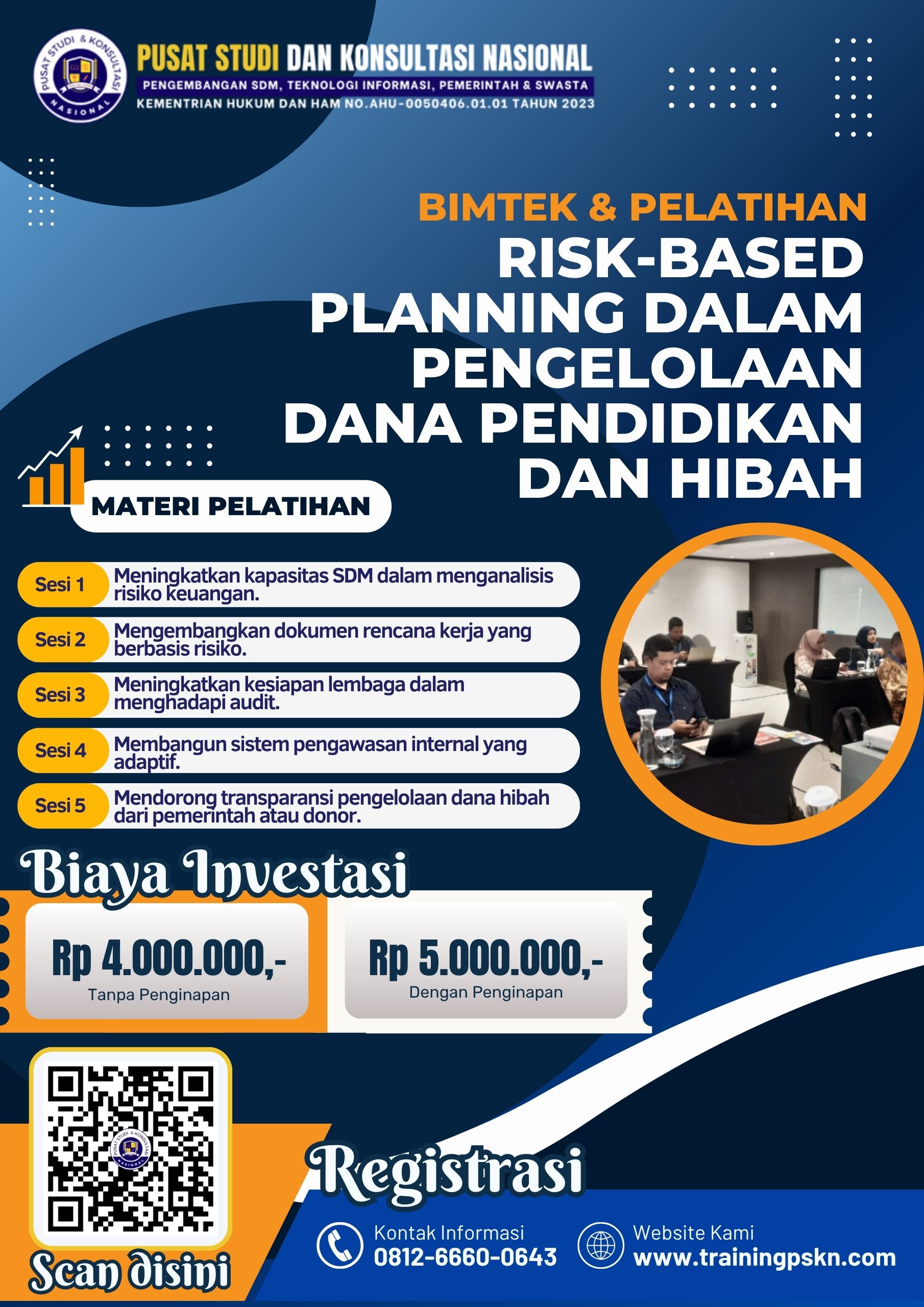 Tingkatkan kemampuan tim Anda dalam mengelola dana pendidikan dan hibah secara profesional melalui Pelatihan Risk-Based Planning bersama Studiknas Training Center. Dapatkan pemahaman komprehensif dan praktik langsung untuk mewujudkan tata kelola pendidikan yang transparan, efektif, dan berbasis risiko.