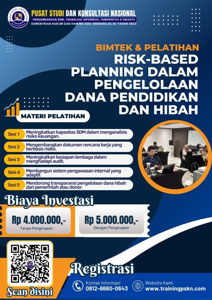 Melalui Pelatihan Risk-Based Planning dalam Pengelolaan Dana Pendidikan dan Hibah, peserta akan mempelajari bagaimana risiko dapat diidentifikasi, dianalisis, dan dimasukkan ke dalam siklus perencanaan agar setiap kebijakan keuangan berbasis pada prinsip kehati-hatian dan keberlanjutan.