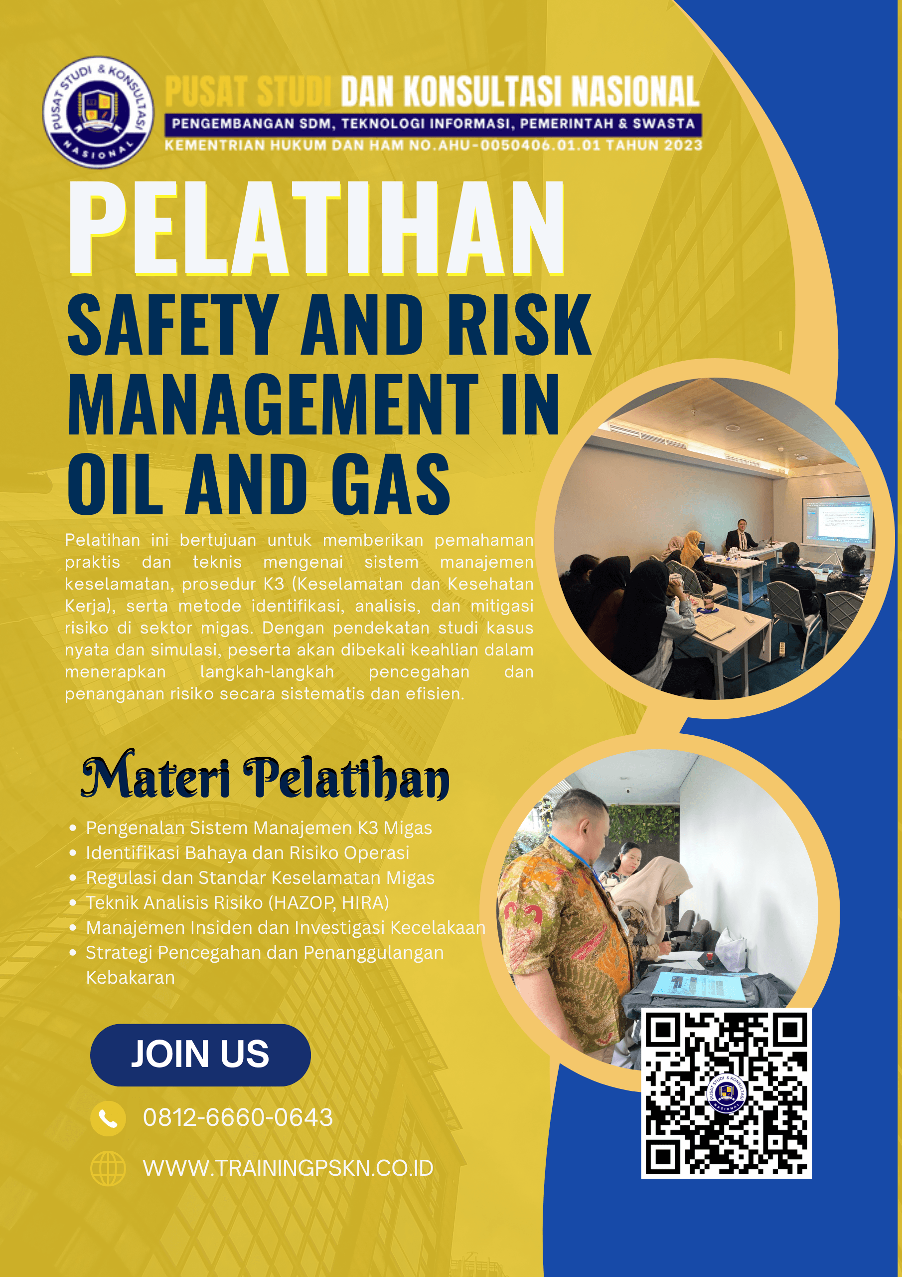Pelatihan ini bertujuan untuk memberikan pemahaman praktis dan teknis mengenai sistem manajemen keselamatan, prosedur K3 (Keselamatan dan Kesehatan Kerja), serta metode identifikasi, analisis, dan mitigasi risiko di sektor migas. Dengan pendekatan studi kasus nyata dan simulasi, peserta akan dibekali keahlian dalam menerapkan langkah-langkah pencegahan dan penanganan risiko secara sistematis dan efisien.