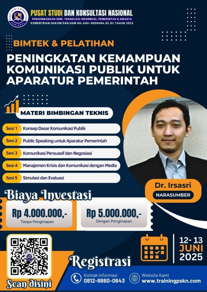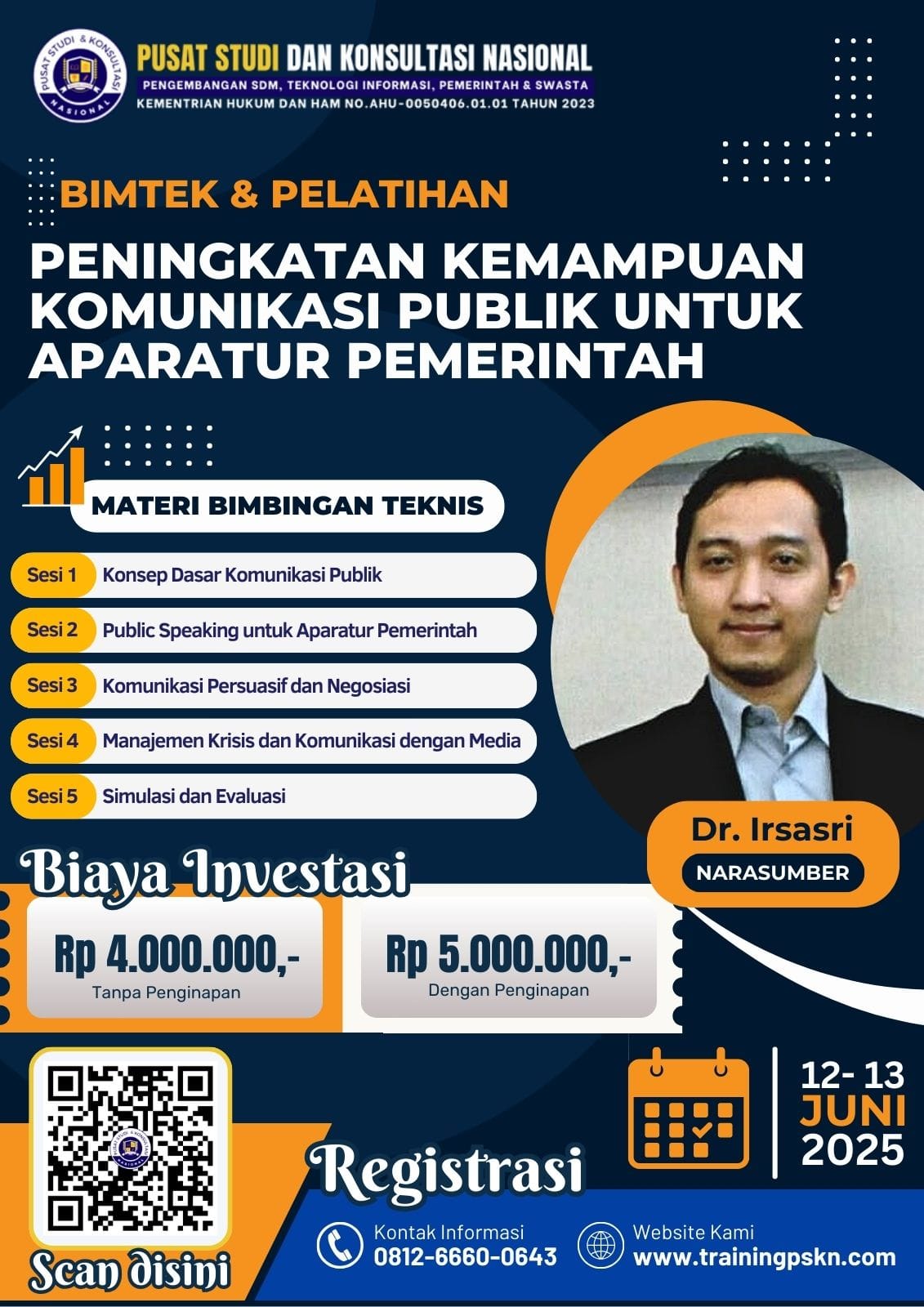 Pelatihan ini dirancang untuk meningkatkan keterampilan komunikasi publik aparatur pemerintah agar lebih efektif, persuasif, dan profesional dalam menyampaikan informasi kepada masyarakat serta pemangku kepentingan lainnya. Dengan komunikasi yang baik, aparatur pemerintah dapat membangun citra positif, meningkatkan kepercayaan publik, dan menyampaikan kebijakan dengan lebih jelas dan transparan.