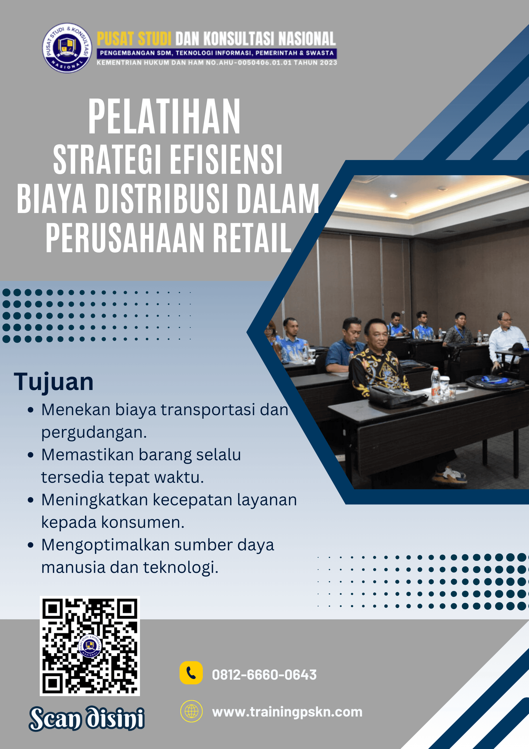 Strategi efisiensi distribusi tidak bisa dilepaskan dari logistik. Oleh karena itu, perusahaan perlu memperkuat kompetensi SDM melalui program pelatihan yang relevan, seperti Pelatihan Manajemen Logistik dan Distribusi untuk Perusahaan Retail dan Industri. Program ini membantu perusahaan memahami praktik terbaik dan teknologi terbaru dalam distribusi.