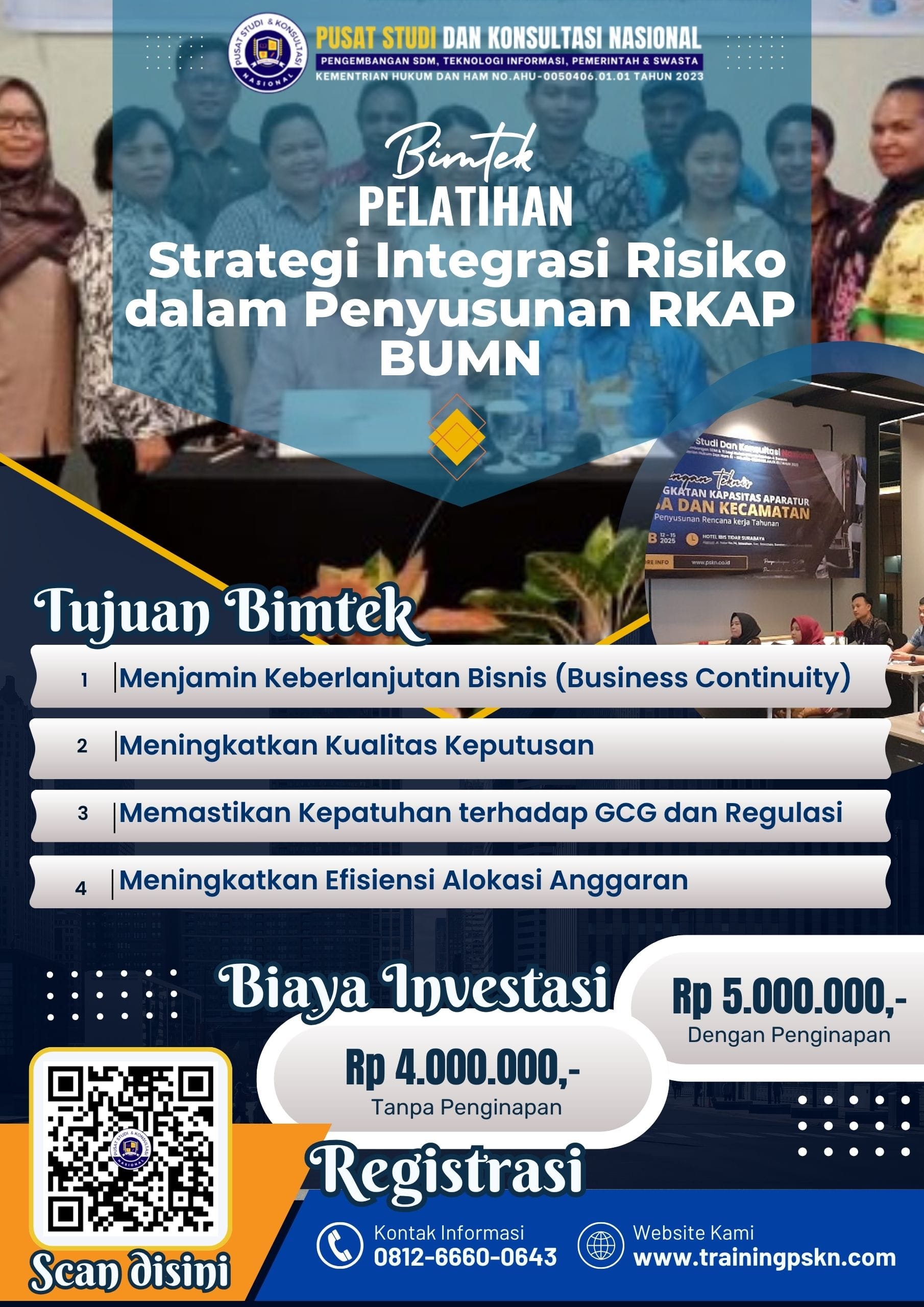 Wujudkan BUMN yang tangguh dan profesional melalui penerapan manajemen risiko terpadu. Ikuti Pelatihan Enterprise Risk Management (ERM) untuk BUMN: Integrasi Risiko dengan GCG dan RKAP dan tingkatkan kapasitas SDM Anda dalam menghadapi dinamika bisnis nasional dan global.