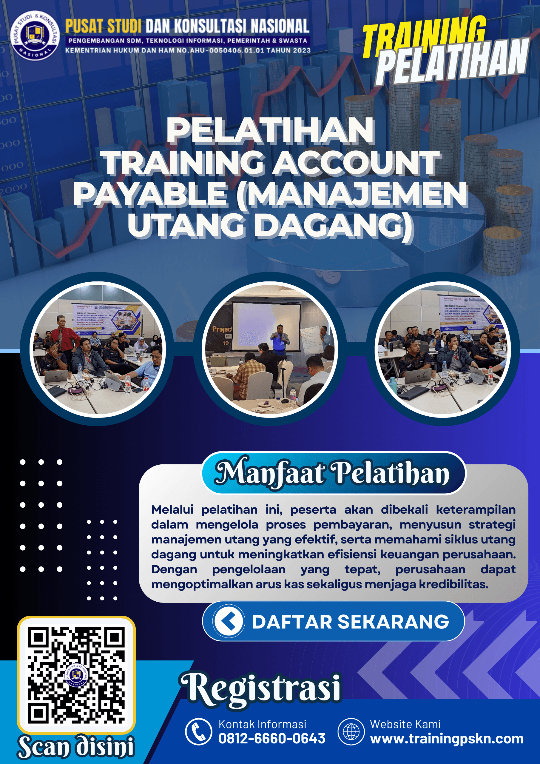 Pelatihan Account Payable atau manajemen utang dagang bertujuan untuk meningkatkan kemampuan peserta dalam mengelola kewajiban pembayaran perusahaan secara efektif dan efisien. Melalui training ini, peserta akan mempelajari konsep dasar account payable, pencatatan transaksi, kebijakan pembayaran, hingga strategi menjaga arus kas agar tetap sehat. Selain itu, peserta juga dibekali teknik analisis pembayaran, audit internal, serta pemanfaatan teknologi dalam sistem keuangan. Dengan mengikuti pelatihan ini, perusahaan dapat meningkatkan kredibilitas, menjaga hubungan baik dengan pemasok, dan meminimalkan risiko finansial akibat pengelolaan utang yang kurang optimal.