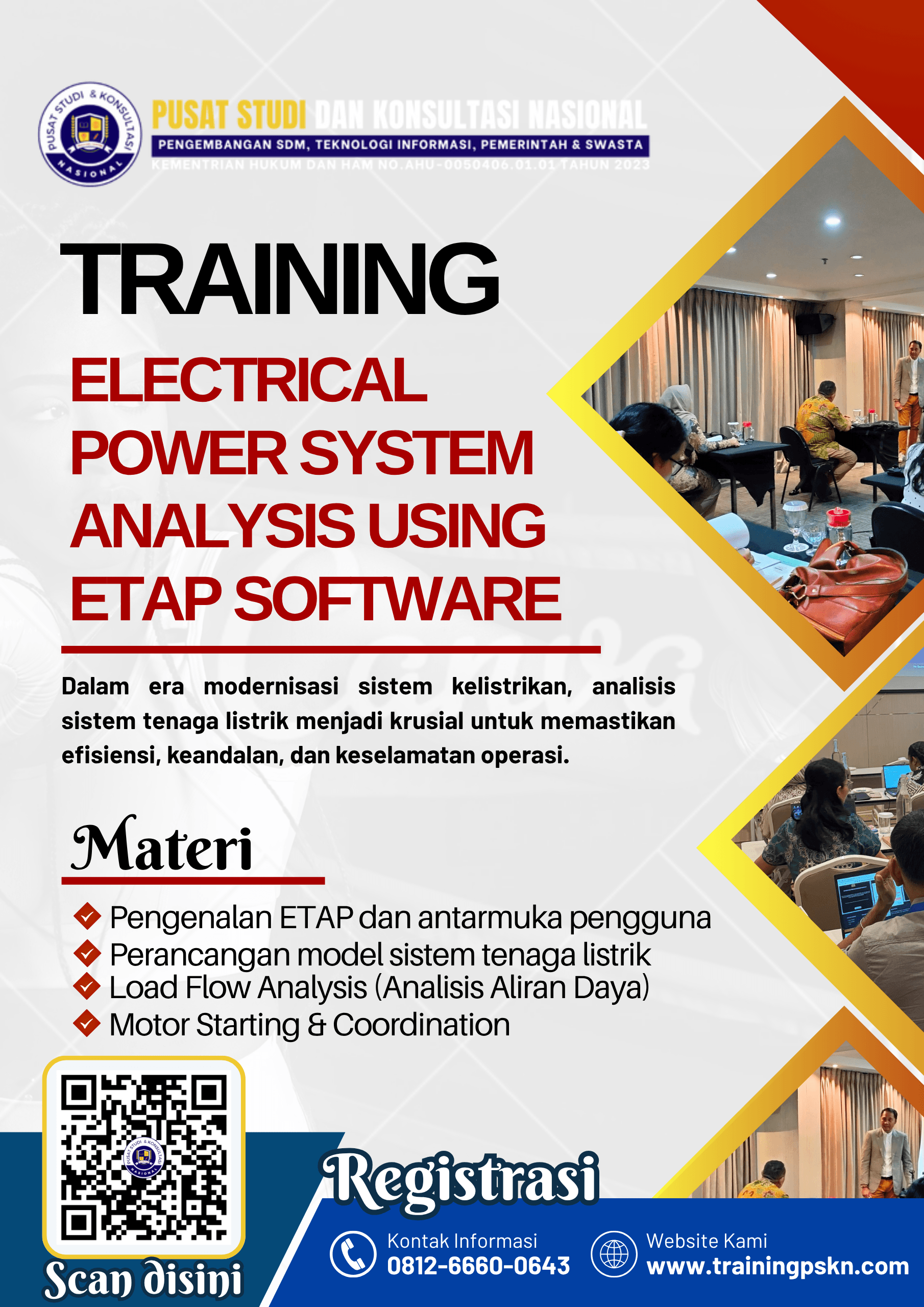 Dalam era modernisasi sistem kelistrikan, analisis sistem tenaga listrik menjadi krusial untuk memastikan efisiensi, keandalan, dan keselamatan operasi. Salah satu perangkat lunak yang paling banyak digunakan untuk analisis tersebut adalah ETAP (Electrical Transient Analyzer Program), yang mampu mensimulasikan dan mengevaluasi sistem kelistrikan secara menyeluruh. Penguasaan ETAP menjadi kebutuhan penting bagi para engineer, teknisi, maupun praktisi dalam mendesain dan mengelola sistem tenaga listrik baik di sektor industri, pembangkitan, distribusi, maupun konsultan teknik.