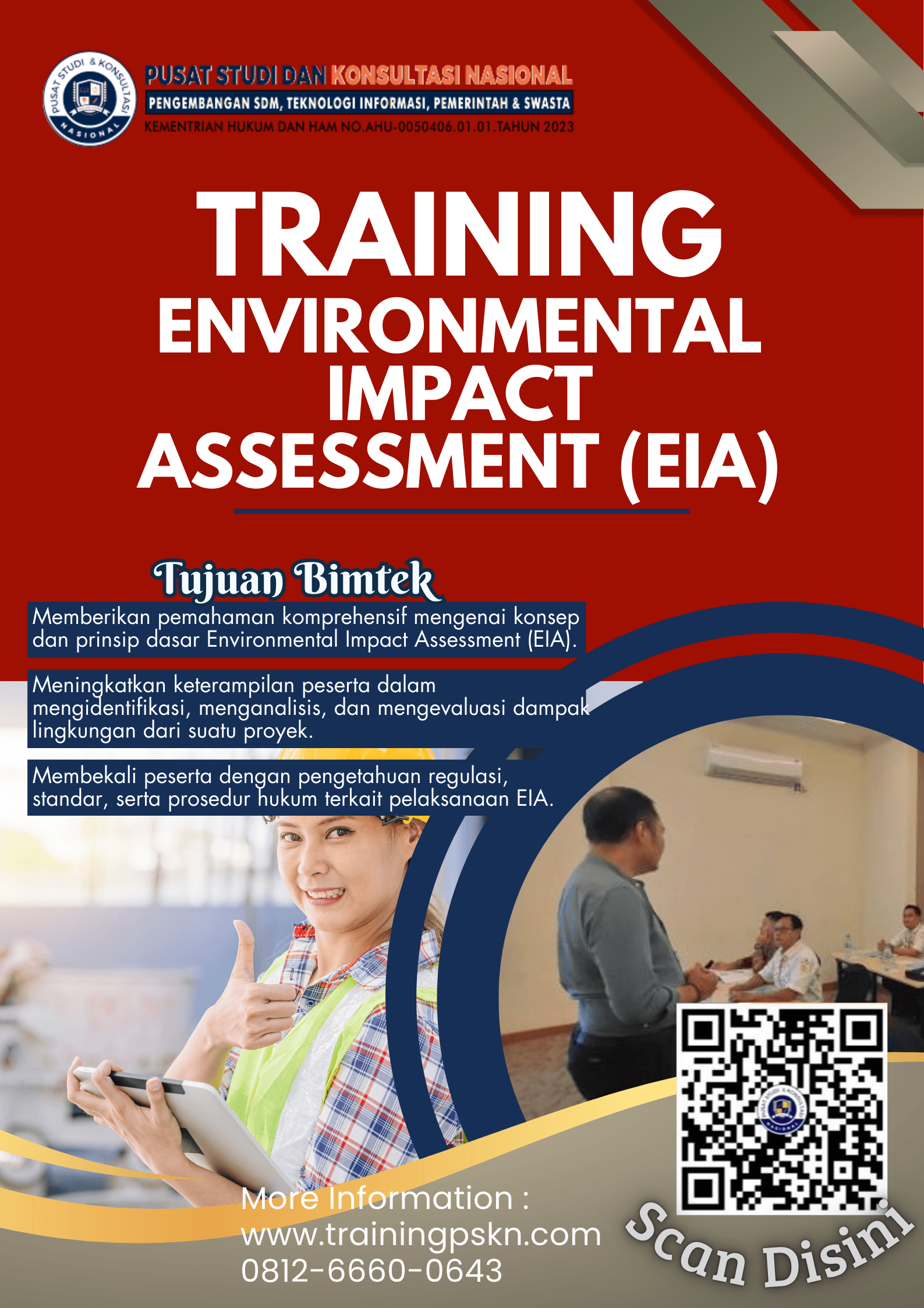 Pelatihan Environmental Impact Assessment (EIA) dirancang untuk membekali peserta dengan pemahaman dan keterampilan dalam menganalisis serta mengevaluasi dampak lingkungan dari suatu proyek. Peserta akan mempelajari konsep dasar EIA, regulasi lingkungan, metode identifikasi dampak, serta teknik penyusunan dokumen EIA sesuai standar nasional. Melalui studi kasus dan simulasi, peserta diharapkan mampu menerapkan EIA secara profesional sehingga mendukung pembangunan berkelanjutan. Pelatihan ini sangat relevan bagi perusahaan sektor energi, pertambangan, konstruksi, maupun pemerintah dalam menjaga keseimbangan antara pembangunan ekonomi dan pelestarian lingkungan.