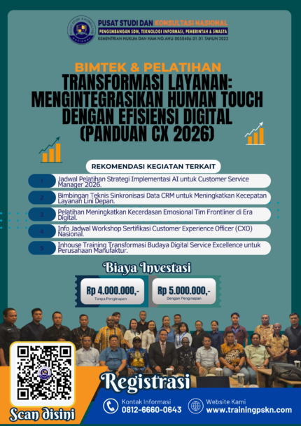 PT. Pusat Studi dan Konsultasi Nasional menyediakan Frontliner Era Digital 2026 Terbaru, Jasa Pelatihan (Training) dan Konsultasi Profesional bagi berbagai pihak, antara lain perusahaan, instansi pemerintah, institusi pendidikan, lembaga non-pemerintah, serta perorangan.